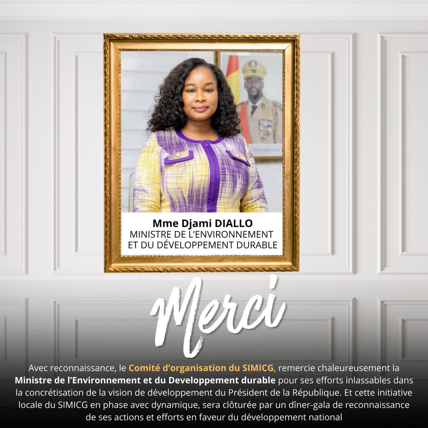 Le Comité d’organisation du SIMICG 2026 adresse ses sincères remerciements à Mme Djami DIALLO, ministre de l’Environnement et du Développement Durable, pour son engagement remarquable et les efforts soutenus qu’elle déploie en faveur d’un développement responsable et durable en Guinée.